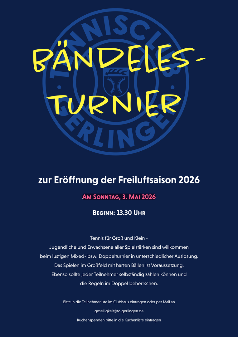 am Sonntag, den 03.05.2025 ab 13:30 Uhr, findet auf unserer schönen Anlage im TC Gerlingen das beliebte Bändelesturnier zur Eröffnung der Freiluftsaison 2026 statt ...