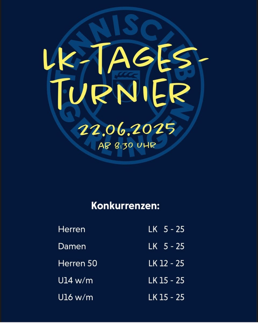am Sonntag, den 22.06.2025 ab 8:30 Uhr, findet auf unserer schönen Anlage im TC Gerlingen ein LK-Tagesturnier für Aktive (Damen und Herren, U14, U16 und Herren Ü50) statt.